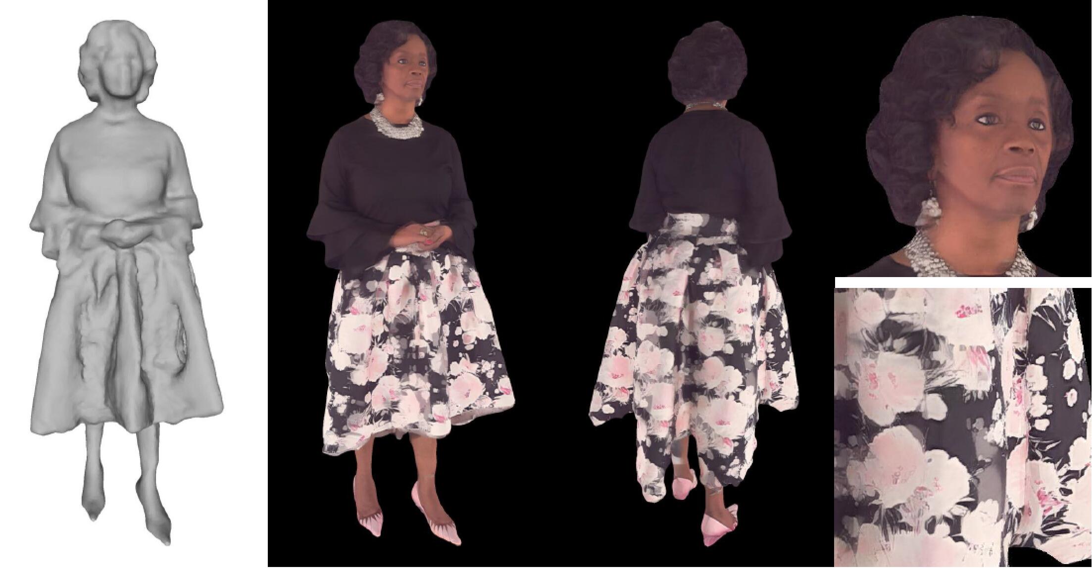 | We aim to address the challenge of novel view rendering of human performers that wear clothes with complex texture patterns using a sparse set of camera views. Our method can render high-quality images at 2k resolution on novel views, and it is a general framework that is able to generalize to novel subjects. |
