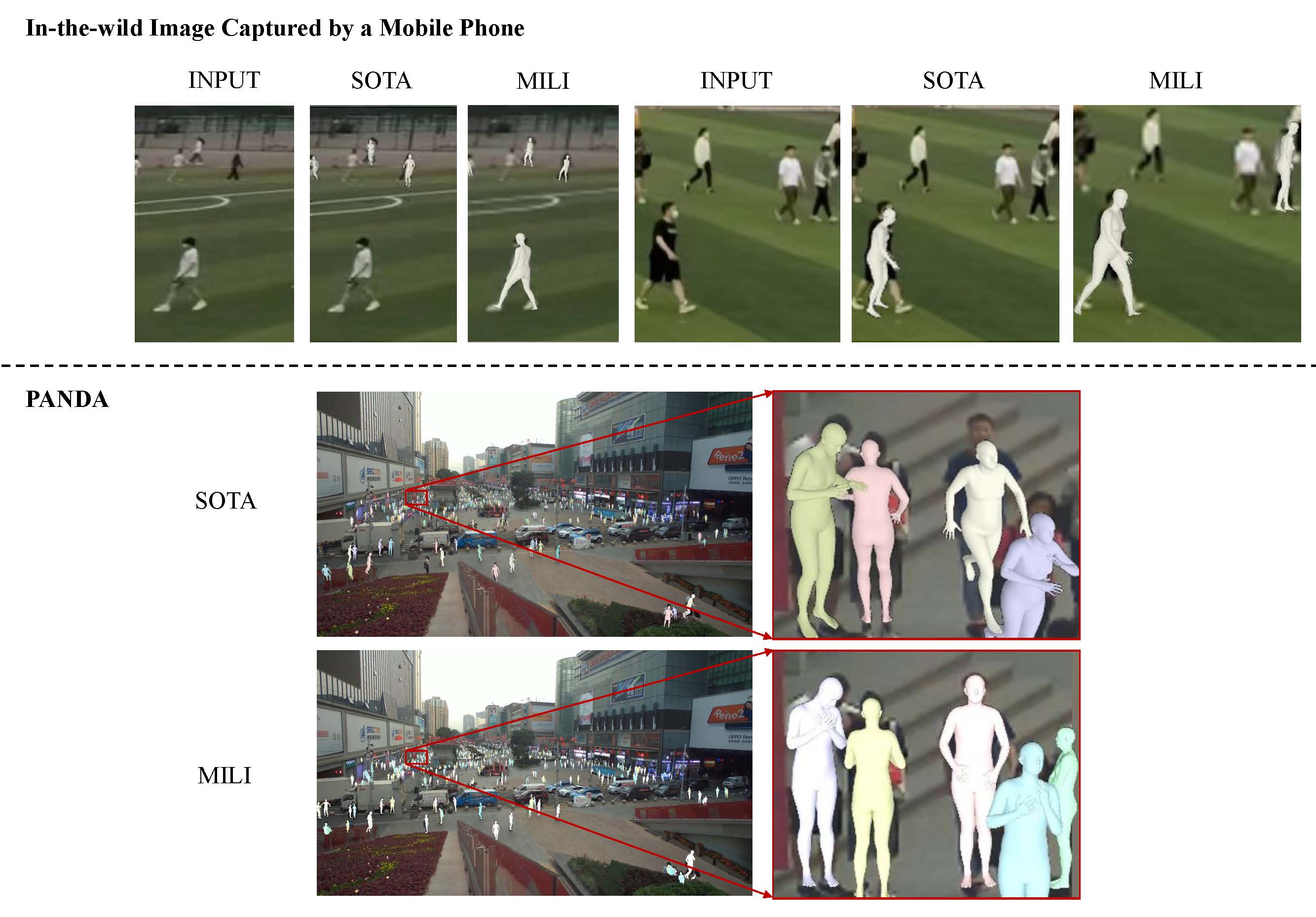 | Existing multi-person reconstruction methods require the human bodies in the input image to occupy a considerable portion of the picture. However, low-resolution human objects are ubiquitous due to trade-off between the field of view and target distance given a limited camera resolution. In this paper, we propose an end-to-end multi-task framework for multi-person inference from a low-resolution image (MILI). |
