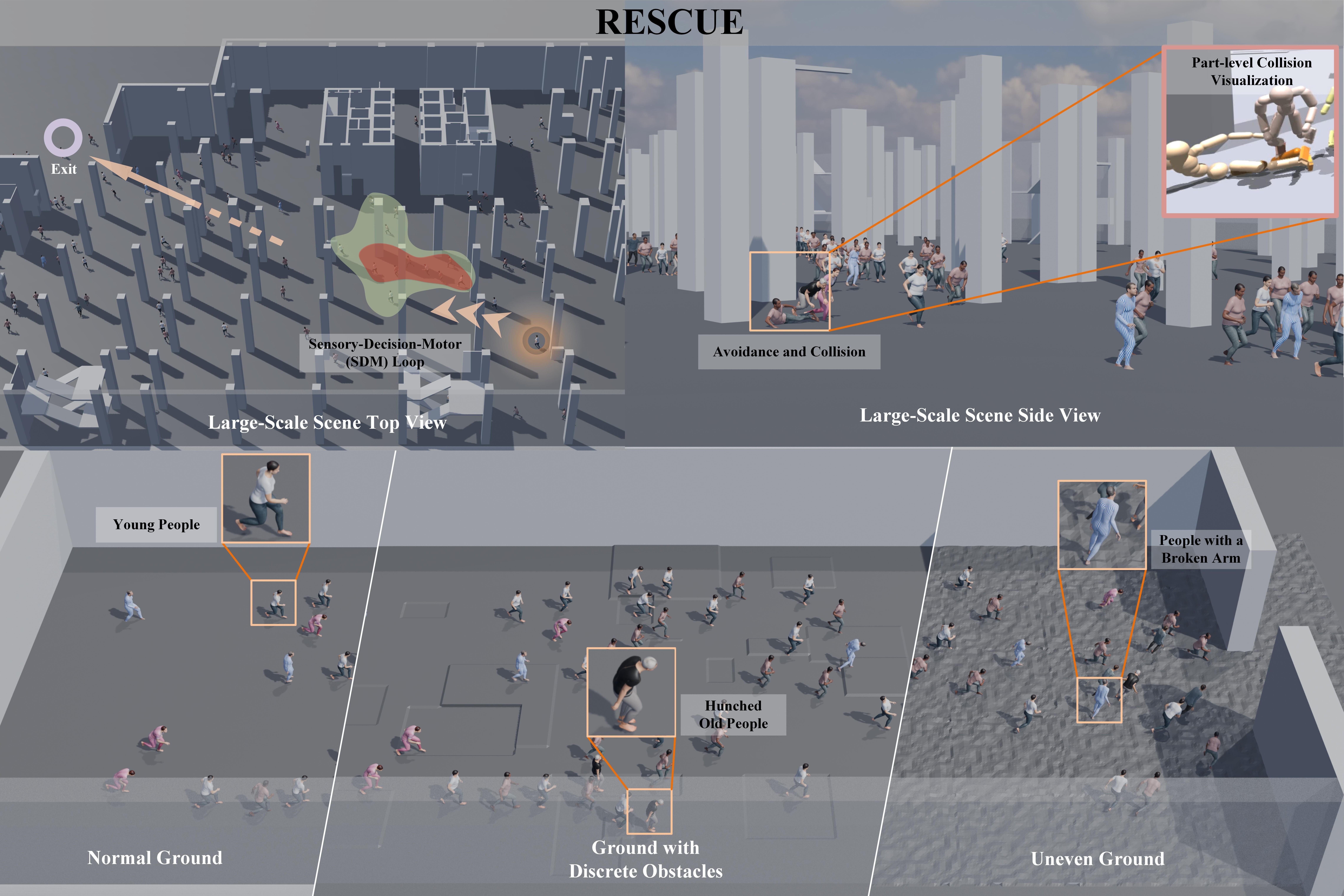 | RESCUE: Crowd Evacuation Simulation via Controlling SDM-United Characters |