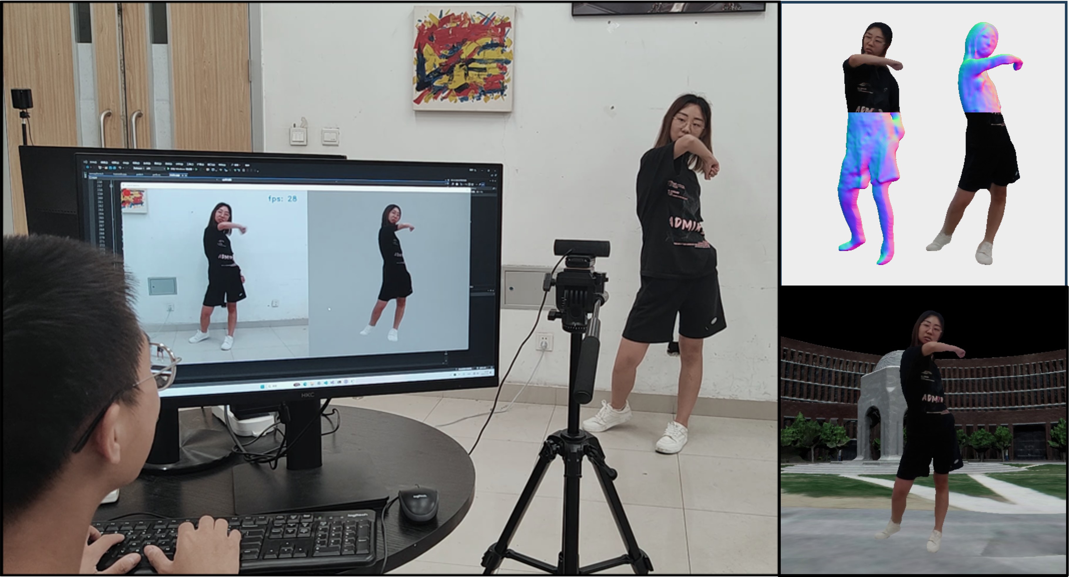 | Transforming 2D human images into 3D appearance is essential for immersive communication. In this paper, we introduce a low-cost real-time 3D human reconstruction and rendering system with a single RGB camera at 28+ FPS, which guarantees both real-time computing speed and realistic rendering results. It can be applied to 3D holographic displays and virtual reality environments. |