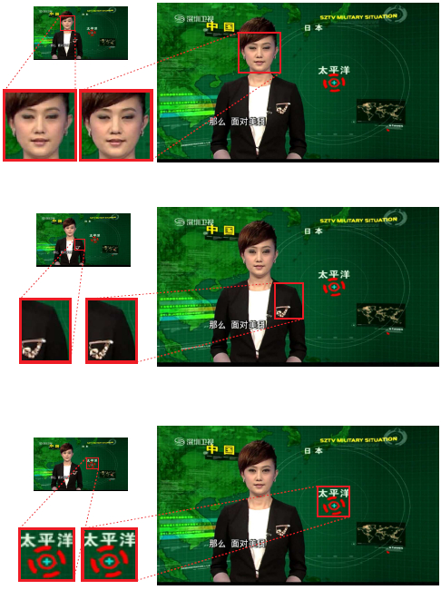 Fig. 6. Super-resolution results of TV sequence by magnifying 3 times. Top row: the
