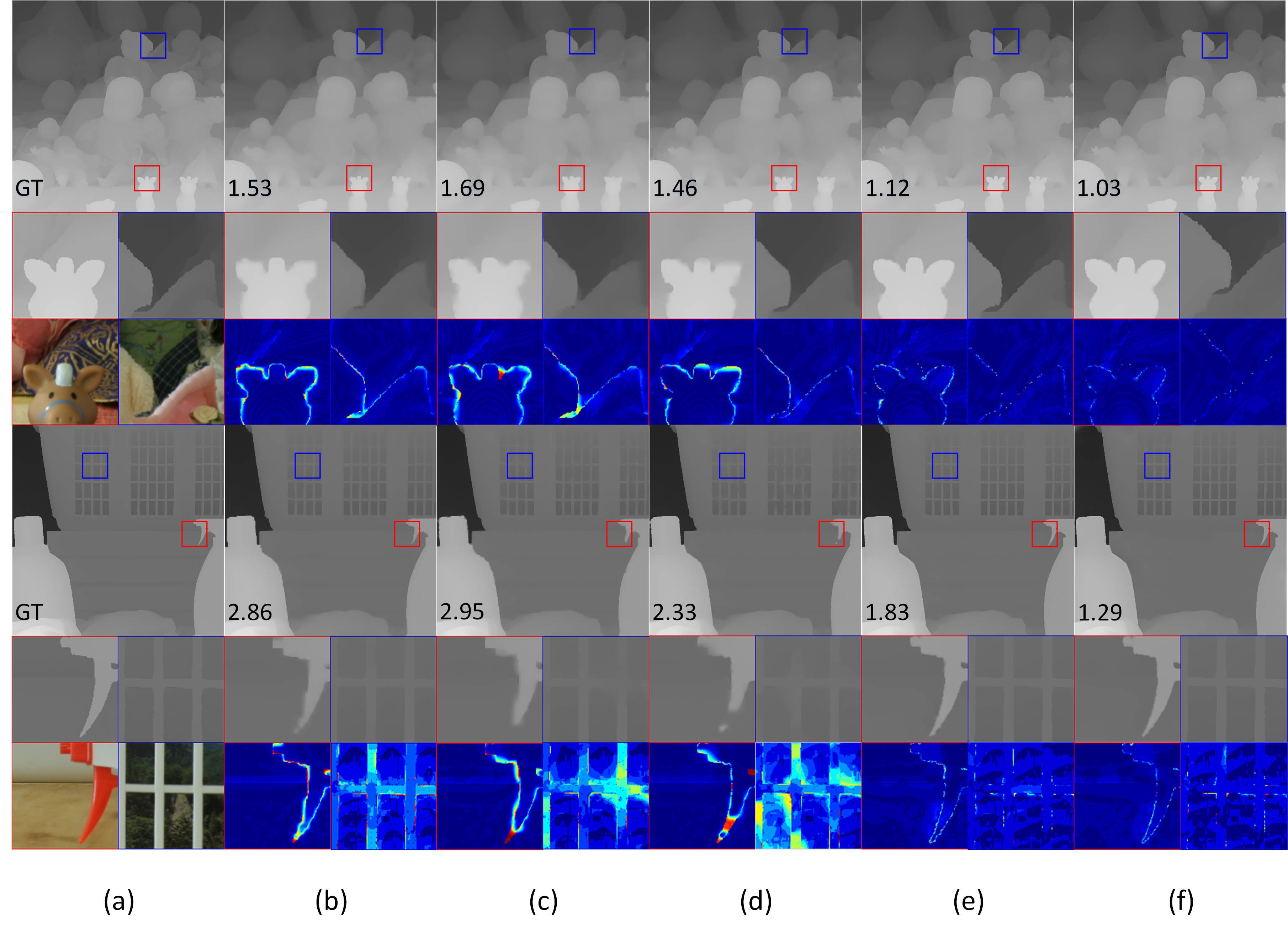 Fig 3. Visual results of depth reconstruction for “Dolls” (top) and “Laundry”(bottom) with different sampling schemes at a ratio of 2.78%: (a) GT RGB-D pair, (b) uniform sampling, (c) random sampling, (d) IPCA [5], (e) our GLINUS0.0, and (f) our GLINUS0.2. For better visualization, we show two cropped patches and the associated error maps.