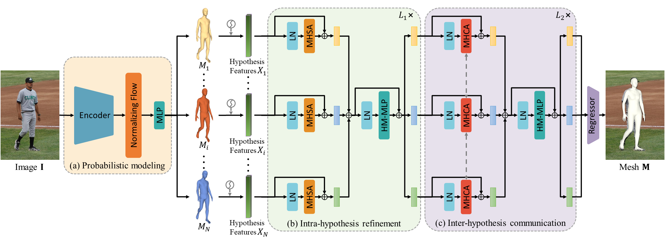 Fig 2. Overview of the proposed method. Given an input monocular image I, we perform probabilistic modeling (a) with normalizing flows to extract image features, predict a pose distribution and generate multiple initial human mesh hypotheses (N indicates the number of hypotheses), input these multi-hypotheses into Intra-hypothesis refinement module (b) for independent refinement and feature enhancement, use Interhypothesis communication module (c) to implement their mutual communication and finally regress to obtain the recovered human mesh M.