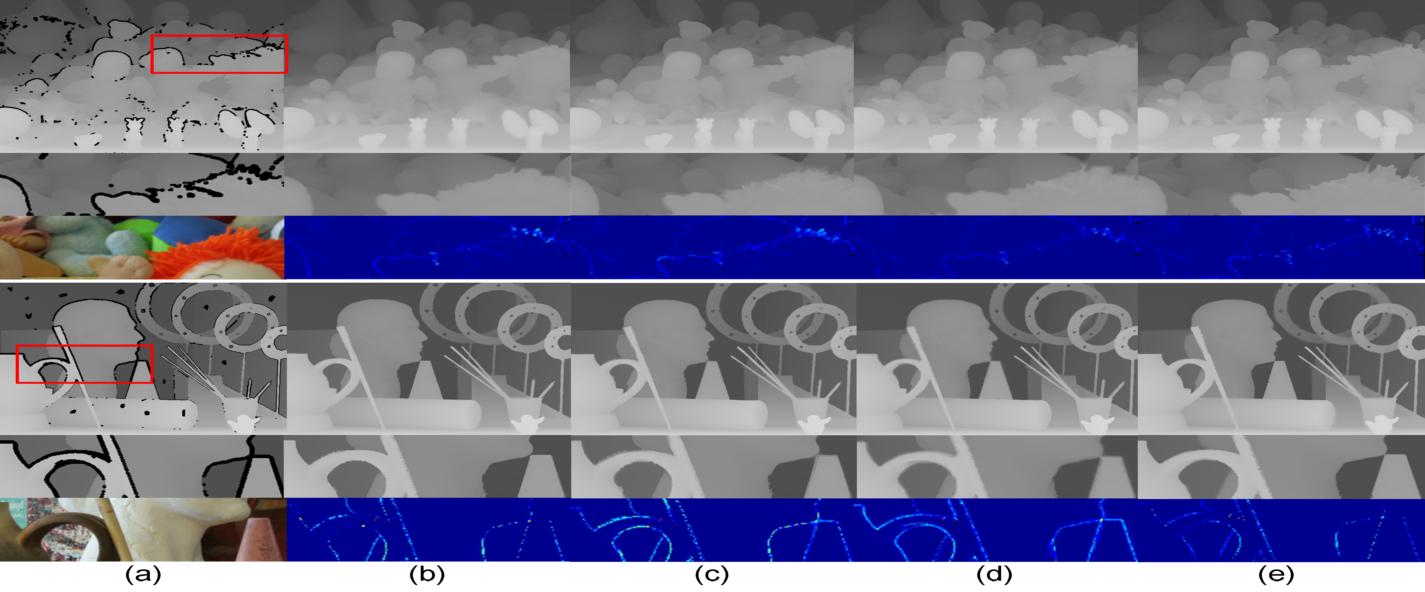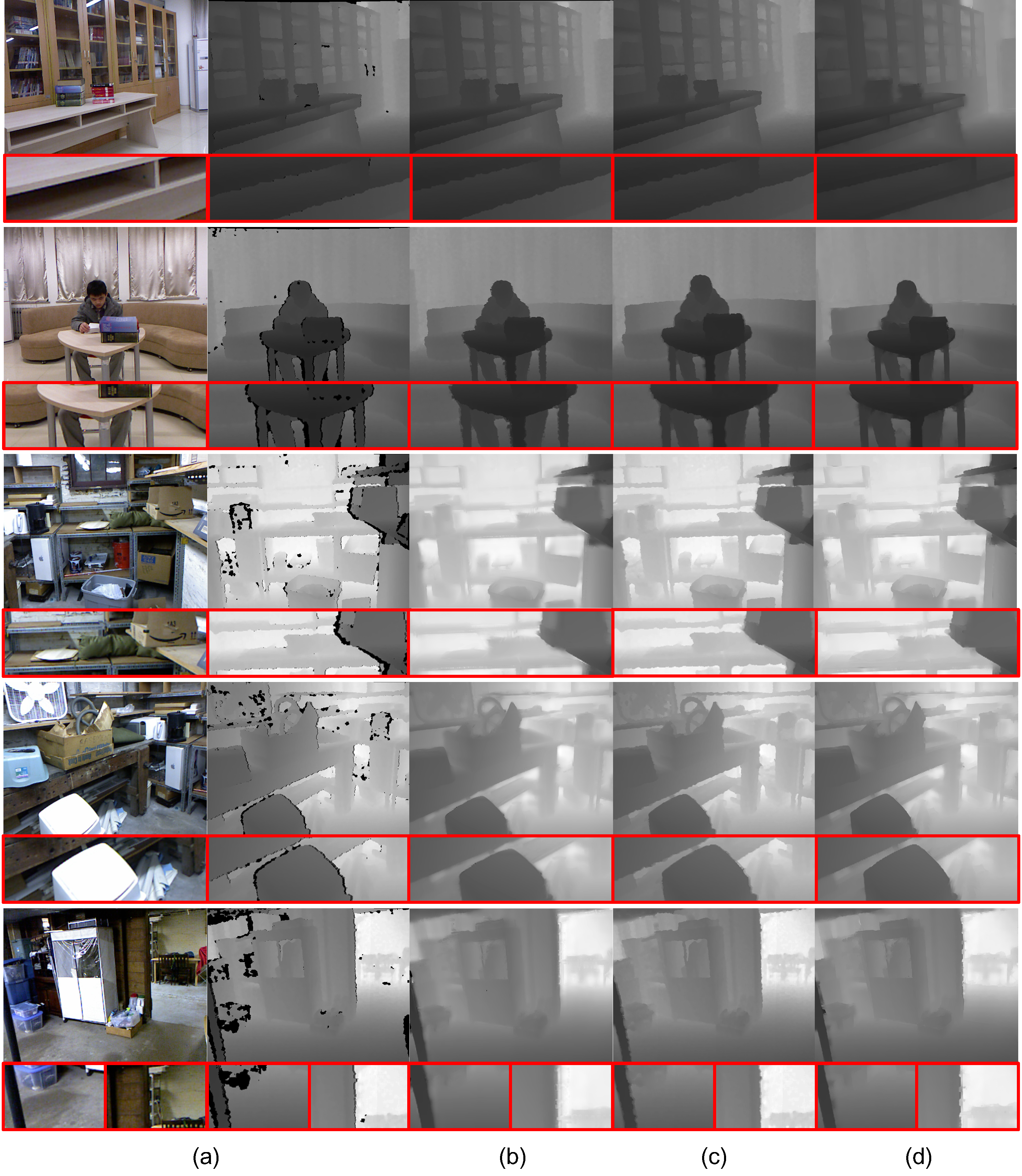 ![]() Fig.7. Depth recovery results for RGB-D pairs captured by Kinect: (a) RDB-D pairs, recovered depth maps by (b) IMLS [2], (c) joint multilateral filtering [12], and (d) our method. Regions highlighted by red rectangles are enlarged for better visual inspection. RGB-D pairs in (a)-(c) are from the NYU RGB-D dataset [13], while the rest two are captured in our lab. Click here to download all the pictures in Fig.7. |