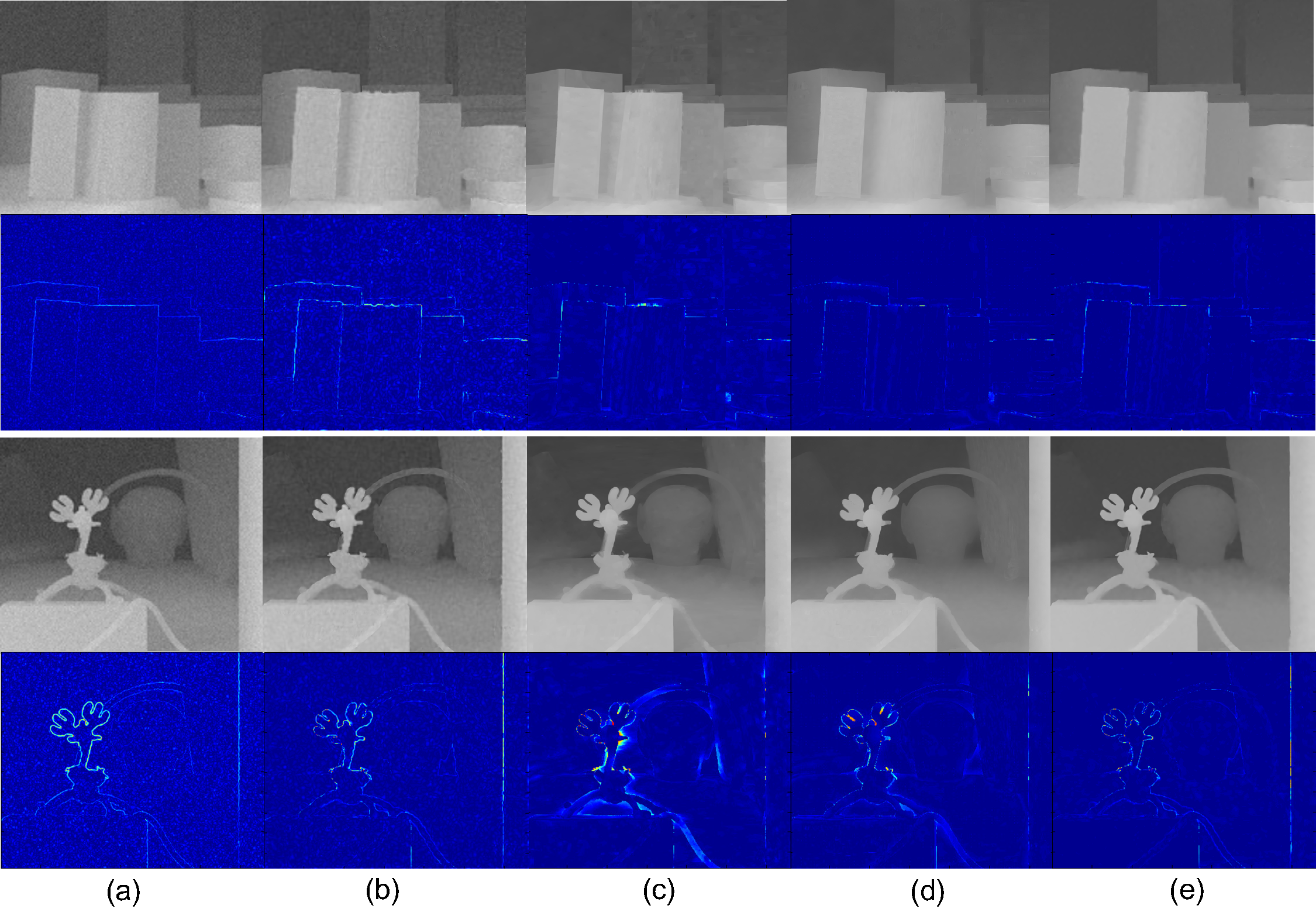 ![]() Fig. 3. Visual quality comparison for recovered depth maps from ToF-like degradation mode (8×upsampling with intense Gaussian noise): depth maps are recovered by (a) Bicubic (MAD: 3.51; 3.82), (b) IMLS [2] (MAD: 2.68; 2.86), (c) EDGE [5] (MAD: 2.07; 3.60), (d) TGV [9] (MAD: 1.49; 1.75), and (e) our method (MAD: 1.15; 1.29). The two MADs for each method are for Book (first) and Reindeer (second) respectively. For visual inspection, the error maps are shown by subtracting between recovered depth and ground truth. |