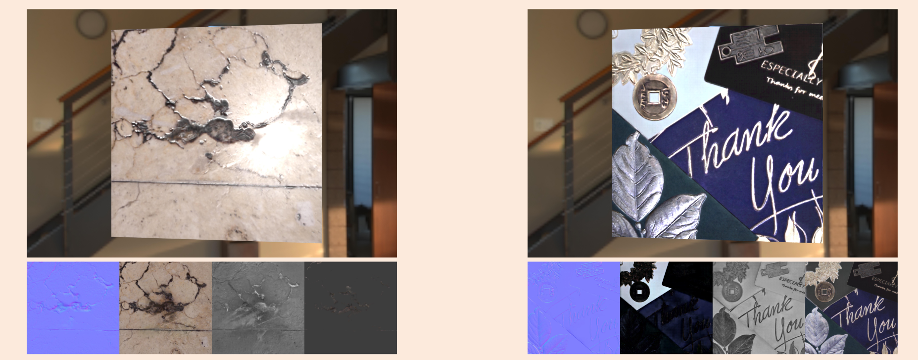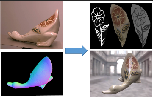 Appearance-from-motion: recovering spatially varying surface reflectance under unknown lighting Yue Dong, Guojun Chen, Pieter Peers, Jiawan Zhang, Xin Tong ACM Trans. on Graphics(Proc. SIGGRAPH ASIA), 33(6): 193:1-193:12 (2014) [Paper(.PDF), 112 MB][Video(.MOV), 92.5 MB], [Talk Slides(.PPTX), 85.7MB] |