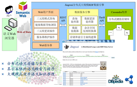 2013-2015年,依托国家863计划项目“基于语义的大数据存储体系结构及关键技术”,搭建了支持Wiki和开放本体的新型分布式大规模RDF数据引擎Jingwei,并在重点领域开展了应用。