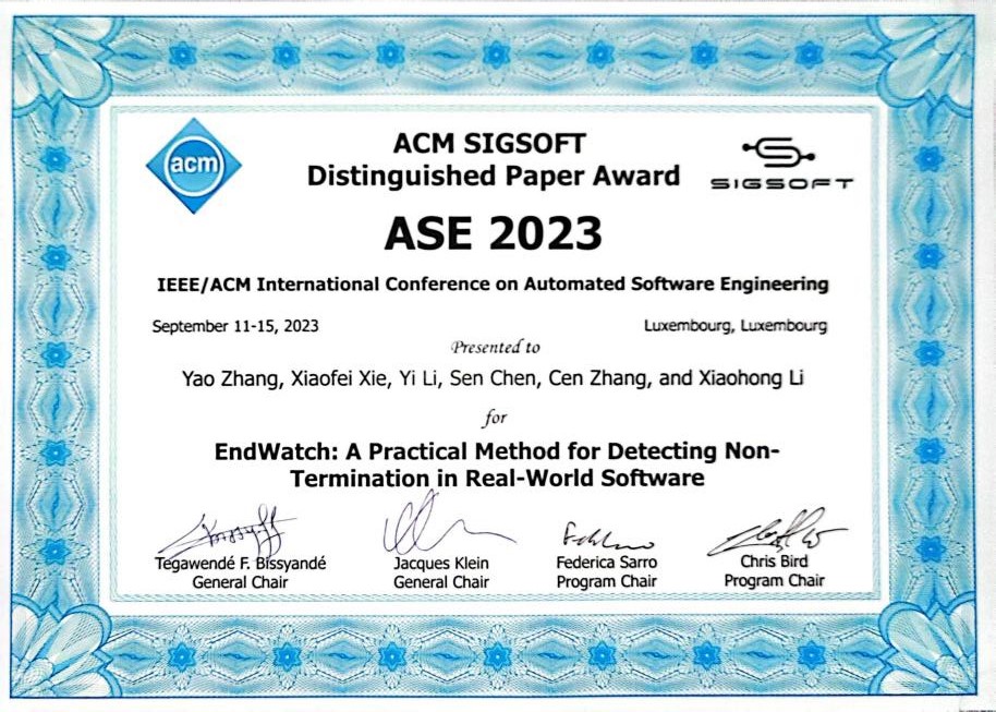 (通讯员 黄静)软件工程领域顶级会议38th IEEE/ACM International Conference on Automated Software Engineering (ASE 2023)于2023年9月11日至15日在卢森堡举办。成人网址 李晓红教授团队的论文《EndWatch: A Practical Method for Detecting Non-Termination in Real-World Software》荣获ASE 2023杰出论文奖(ACM SIGSOFT Distinguished Paper Award)。该工作由成人网址 、新加坡管理大学以及新加坡南洋理工大学合作完成,其中第一作者为博士生张瑶,指导教师为新加坡管理大学谢肖飞副教授、南洋理工大学李一副教授、成人网址 陈森副教授、南洋理工大学张岑博士以及课题组负责人李晓红教授。