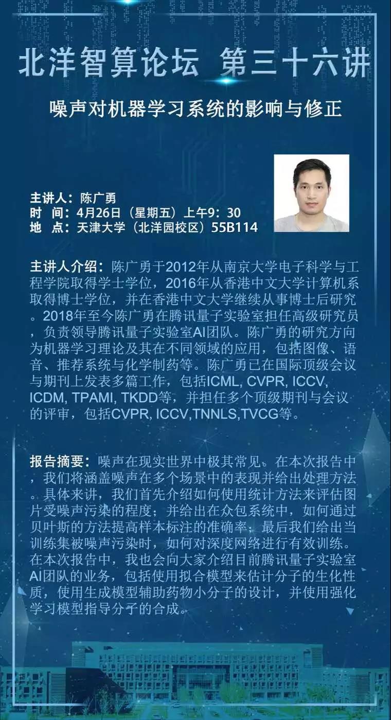 陈广勇于2012年从南京大学电子科学与工程学院取得学士学位,2016年从香港中文大学计算机系取得博士学位,并在香港中文大学继续从事博士后研究。2018年至今陈广勇在腾讯量子实验室担任高级研究员,负责领导腾讯量子实验室AI团队。陈广勇的研究方向为机器学习理论及其在不同领域的应用,包括图像、语音、推荐系统与化学制药等。陈广勇已在国际顶级会议与期刊上发表多篇工作,包括ICML, CVPR, ICCV, ICDM, TPAMI, TKDD等,并担任多个顶级期刊与会议的评审,包括CVPR, ICCV, TNNLS, TVCG等。