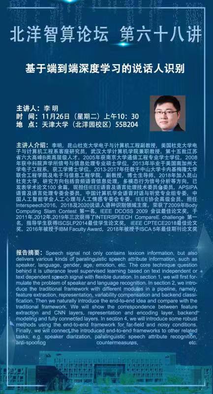 李明,昆山杜克大学电子与计算机工程副教授,美国杜克大学电子与计算机工程系客座研究员,武汉大学计算机学院兼职教授。第十五批江苏省六大高峰B类高层级人才。2005年获南京大学通信工程专业学士学位,2008年获中科院声学所信号与信息处理专业硕士学位,2013年毕业于美国南加州大学电子工程系,获工学博士学位。已发表学术论文100 余篇,现担任IEEE语音及语言处理技术委员会委员,APSIPA 语音及语言处理专委会委员,中国计算机学会语音对话与听觉专业组专委,中国人工智能学会人工心理与人工情感专委会专委,IEEE协会高级会员。担任Interspeech2016,2018及2020说话人语种识别领域主席。