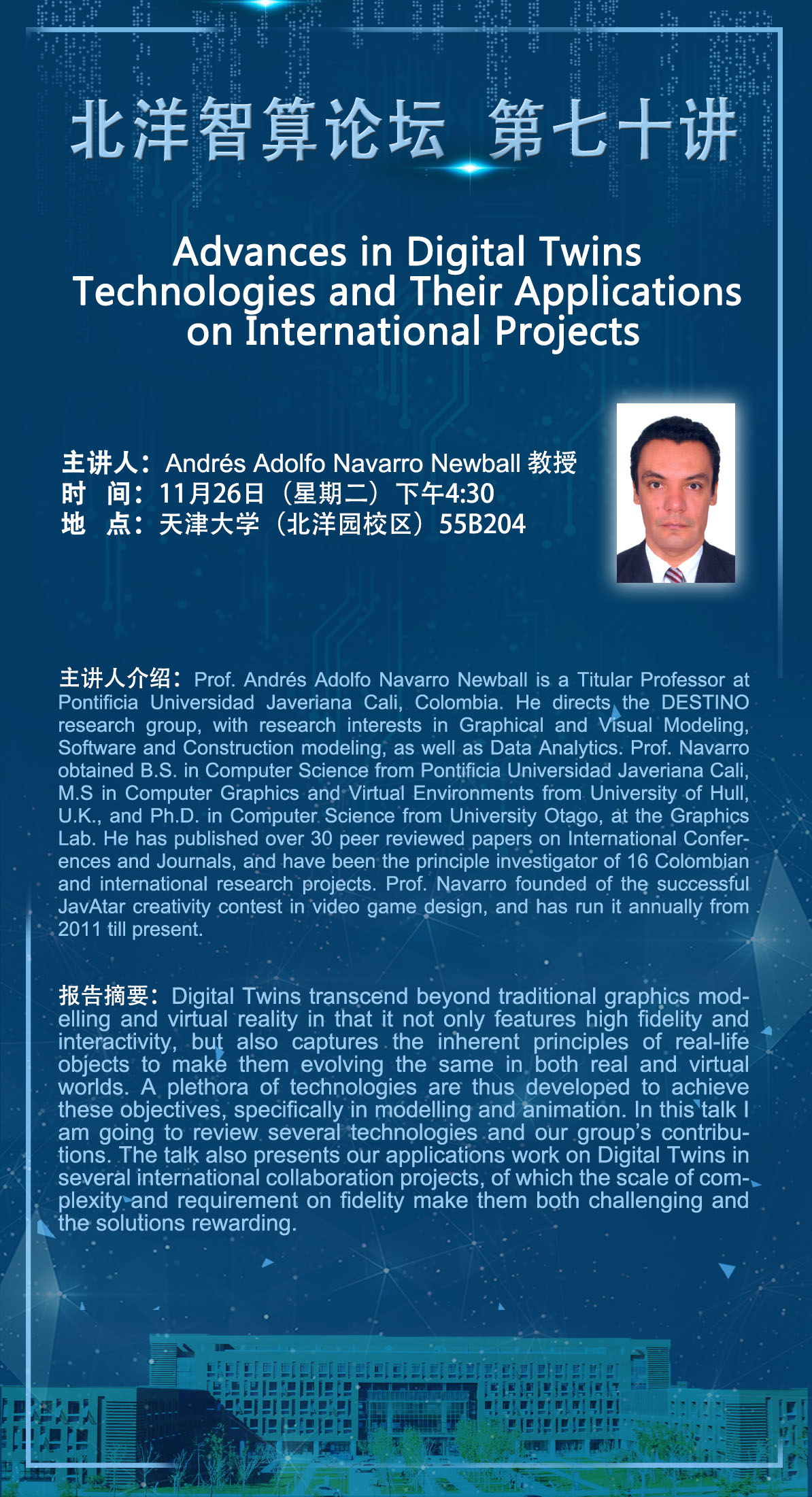 Andrés Adolfo Navarro Newball教授是哥伦比亚哈维里亚纳卡里大学的讲席教授。他领导的DESTINO小组,主要研究方向包括计算机图形学和可视化建模,软件和构造建模以及数据分析。Navarro教授获得过哈维里亚纳卡里大学的计算机科学学士学位,英国赫尔大学的计算机图形学和虚拟环境硕士学位以及奥塔哥大学计算机科学博士学位。他在国际会议和期刊上发表了30多篇同行评审论文,并且是16个哥伦比亚和国际研究项目的首席研究员。Navarro教授创立了JavAtar电子游戏创意大赛,从2011年至今每年举办一次。
