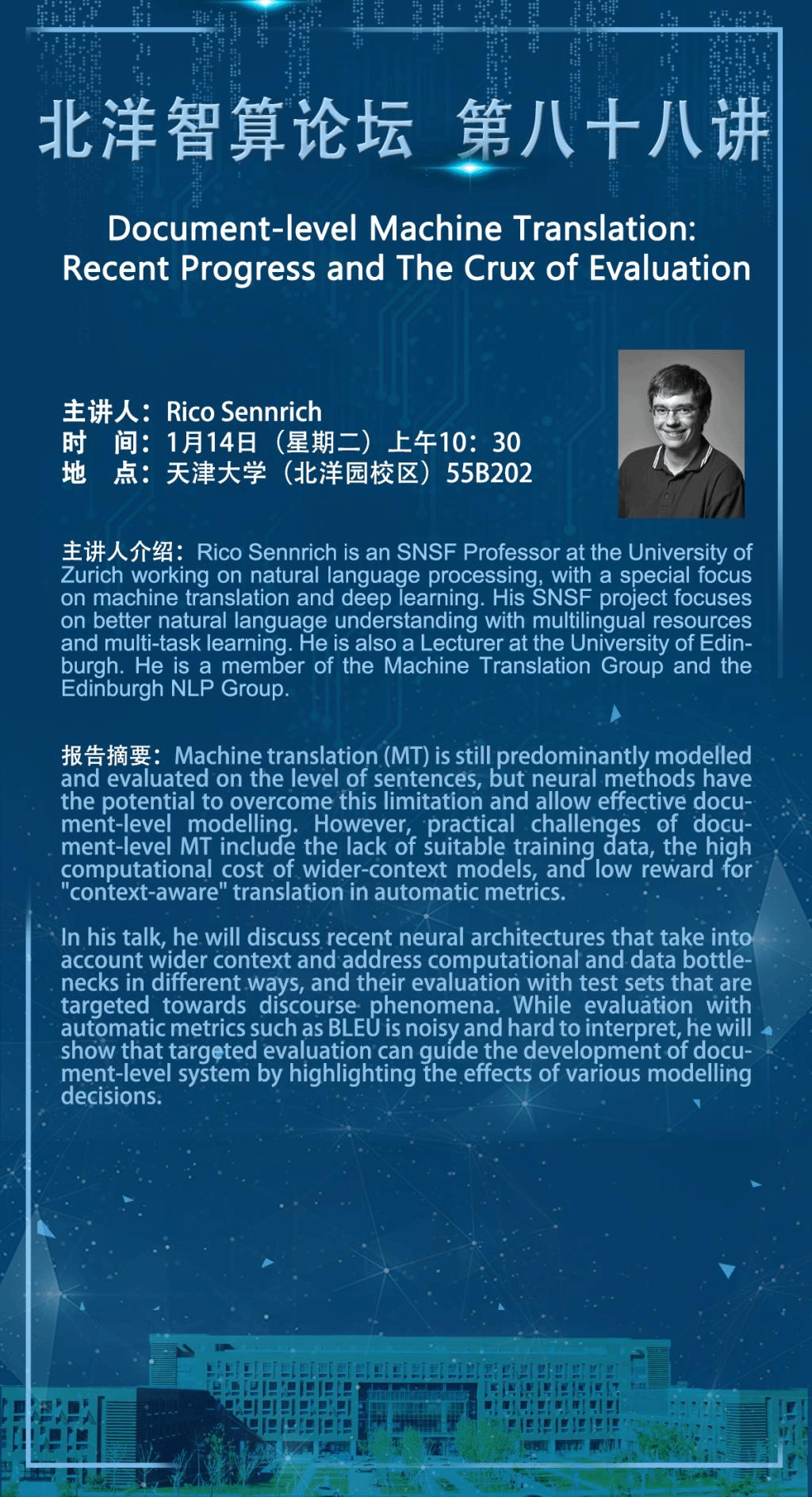 In his talk, he will discuss recent neural architectures that take into account wider context and address computational and data bottlenecks in different ways, and their evaluation with test sets that are targeted towards discourse phenomena. While evaluation with automatic metrics such as BLEU is noisy and hard to interpret, he will show that targeted evaluation can guide the development of document-level system by highlighting the effects of various modelling decisions.