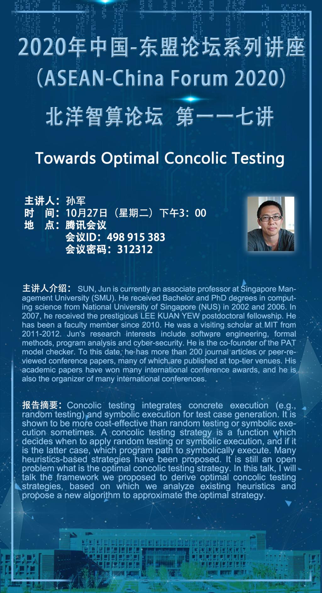 Concolic testing integrates concrete execution (e.g., random testing) and symbolic execution for test case generation. It is shown to be more cost-effective than random testing or symbolic execution sometimes. A concolic testing strategy is a function which decides when to apply random testing or symbolic execution, and if it is the latter case, which program path to symbolically execute. Many heuristics-based strategies have been proposed. It is still an open problem what is the optimal concolic testing strategy. In this talk, I will talk the framework we proposed to derive optimal concolic testing strategies, based on which we analyze existing heuristics and propose a new algorithm to approximate the optimal strategy.